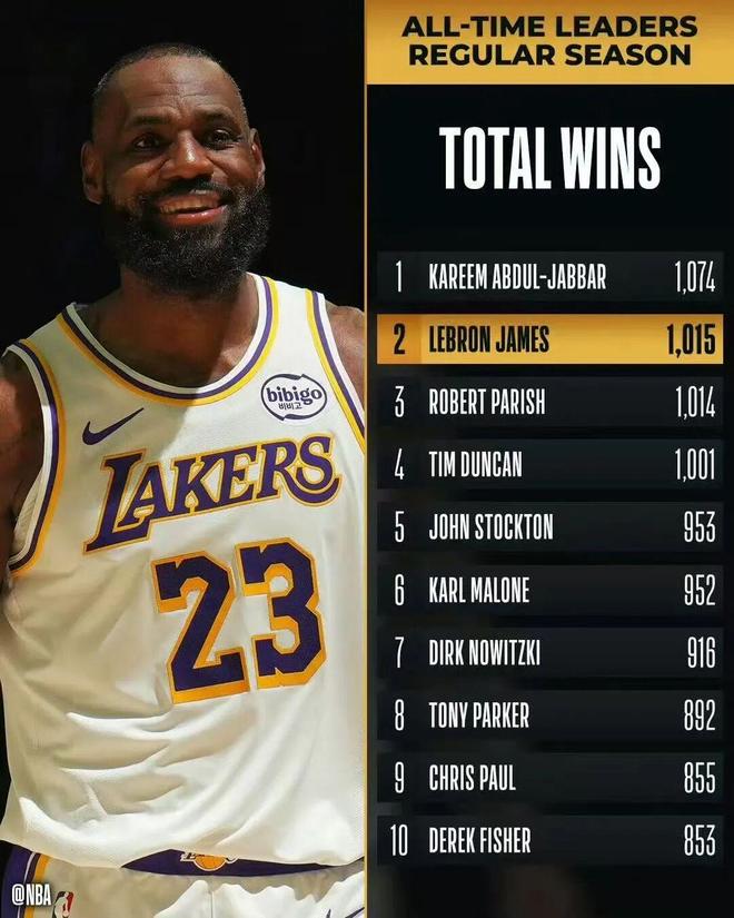 他的常規(guī)賽總勝場(chǎng)數(shù)來到NBA歷史第二