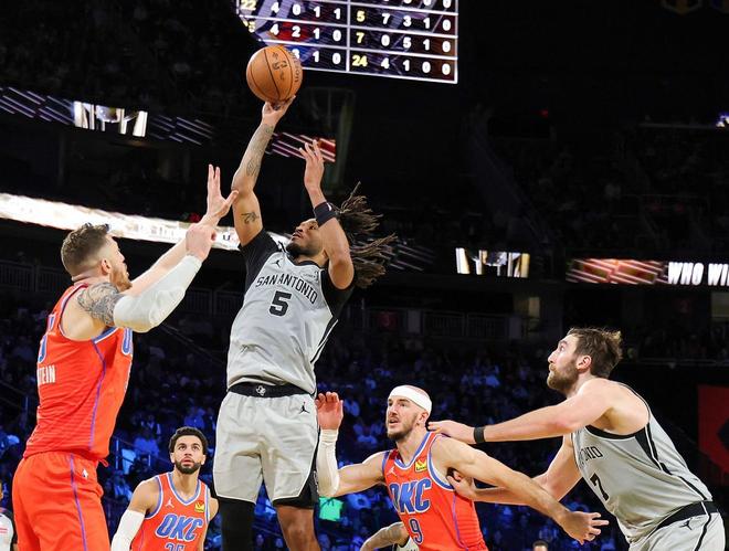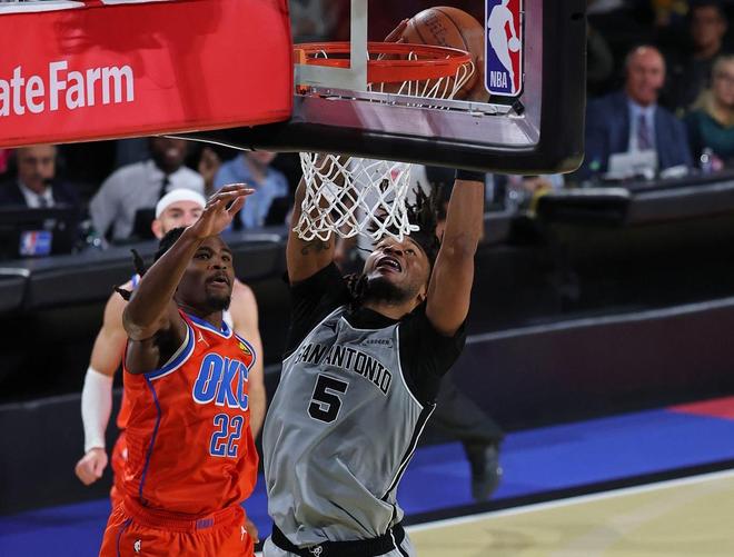 卡斯爾在這時候勇敢地站了出來,他突破拋投得分,接著在瓦塞爾的助攻下扣籃得分,馬刺94比93領(lǐng)先1分??ㄋ範栐诒荣悤r間還剩4分11秒發(fā)底線球助攻文班空接扣籃得分。比賽時間還剩9.8秒,卡斯爾被卡森·華萊士犯規(guī)后穩(wěn)穩(wěn)罰進兩球,幫助馬刺繼續(xù)領(lǐng)先3分。卡斯爾在比賽時間只剩1.5秒的時候果斷對杰倫·威廉姆斯犯規(guī),不給他出手三分球的機會,杰威第二罰故意不進,卡魯索倉促補籃不中。