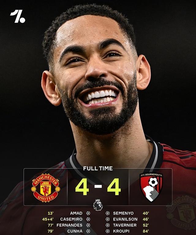 第84分鐘,曼聯(lián)后場(chǎng)被斷,伯恩茅斯反擊,克魯皮推射破門,4-4!