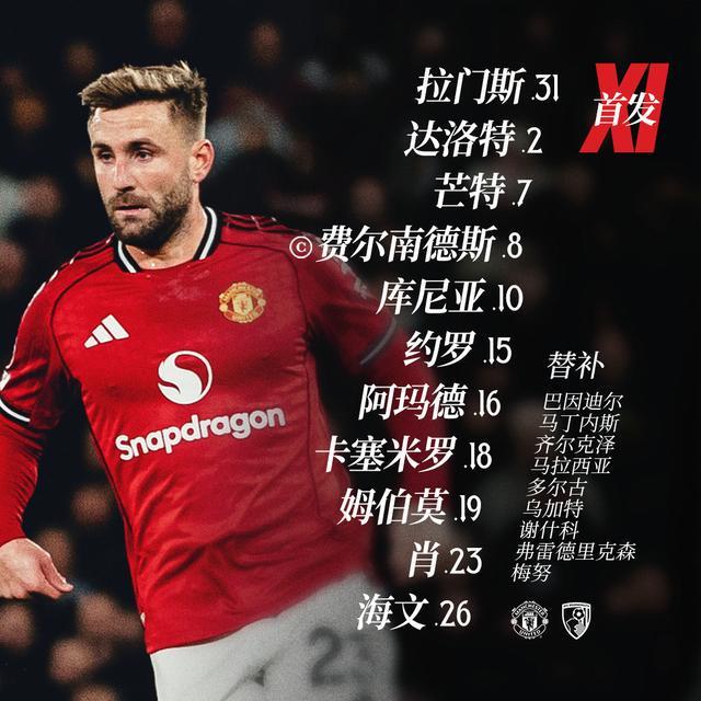 面對(duì)正處中下游的櫻桃軍團(tuán),阿莫林派上了庫(kù)尼亞單箭頭,身后是姆伯莫和芒特。后防線有所輪換,約羅、艾登-海文和盧克-肖搭檔三中衛(wèi),為這場(chǎng)比賽的抽象埋下了伏筆!